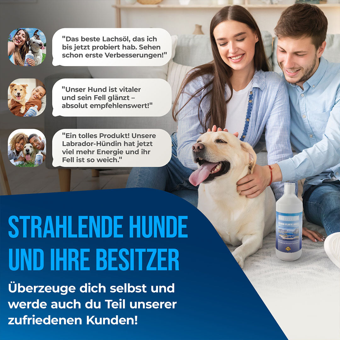 Einzelpreis €35,80 pro lREINES LACHSÖL – NatiVivo Premium Lachsöl ist zu 100 % natürlich, frei von Konservierungsstoffen und ohne Zusätze. Premium Fischöl für Hunde, Katzen und Pferde – naturbelassen und hochwertig.