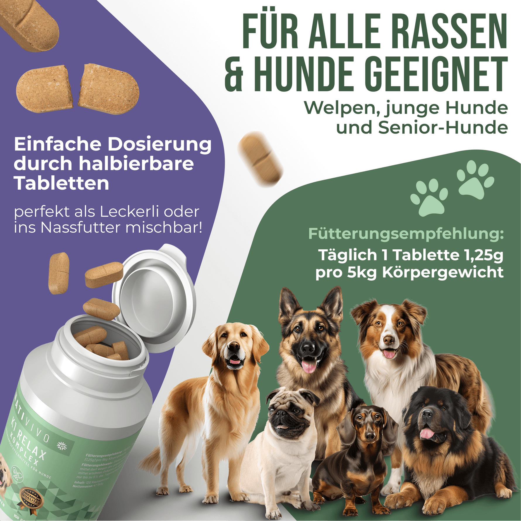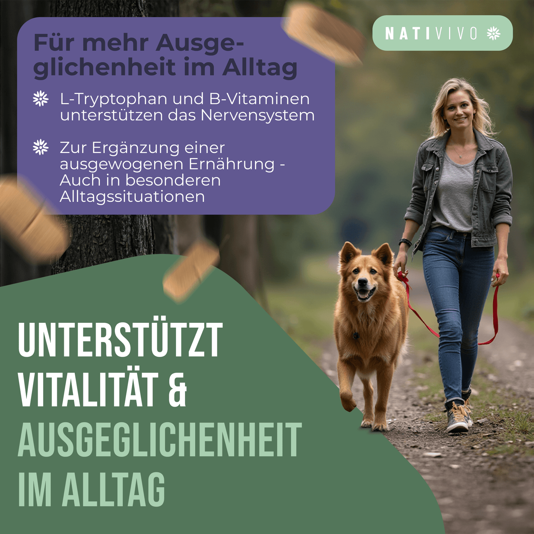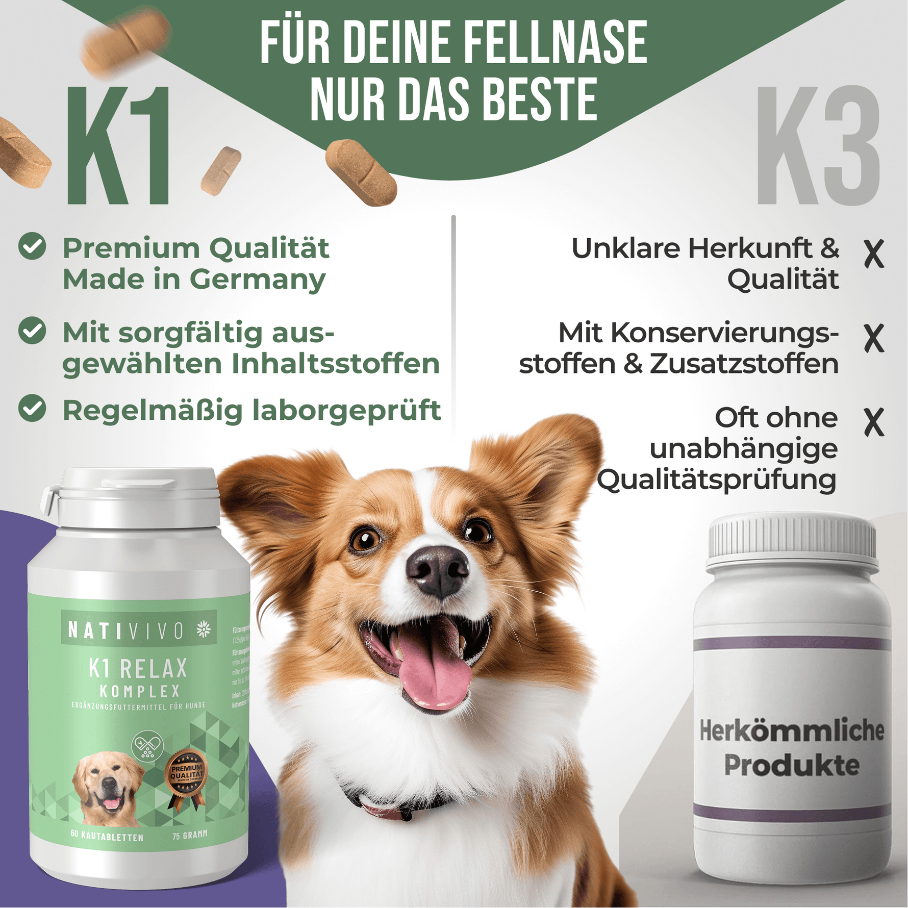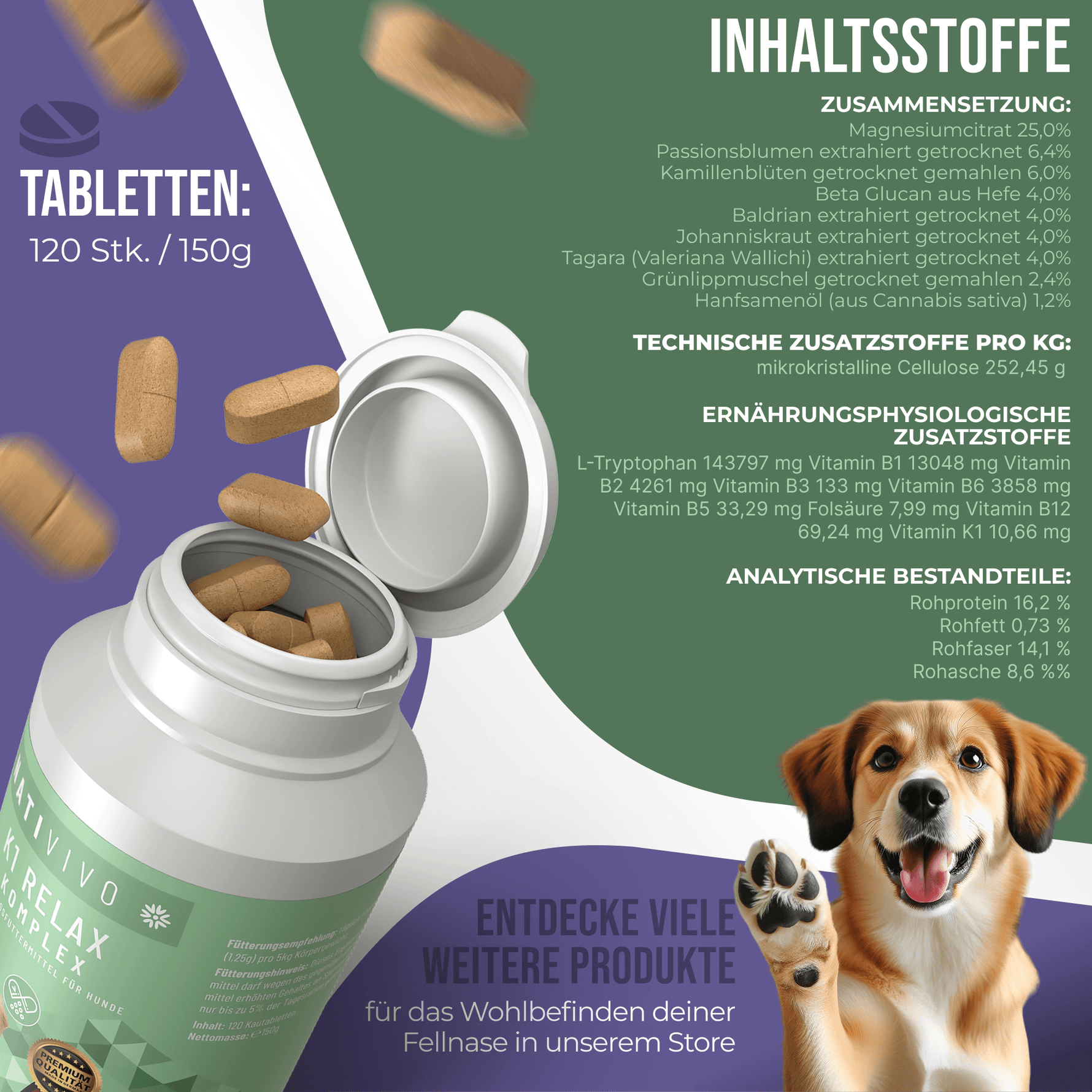 NatiVivo Premium Hunde K1 Relax Komplex – mit Baldrian, Hanfsamenöl & natürlichen Inhaltsstoffen - Unterstützt Ruhe, Gelassenheit & Ausgeglichenheit im Alltag